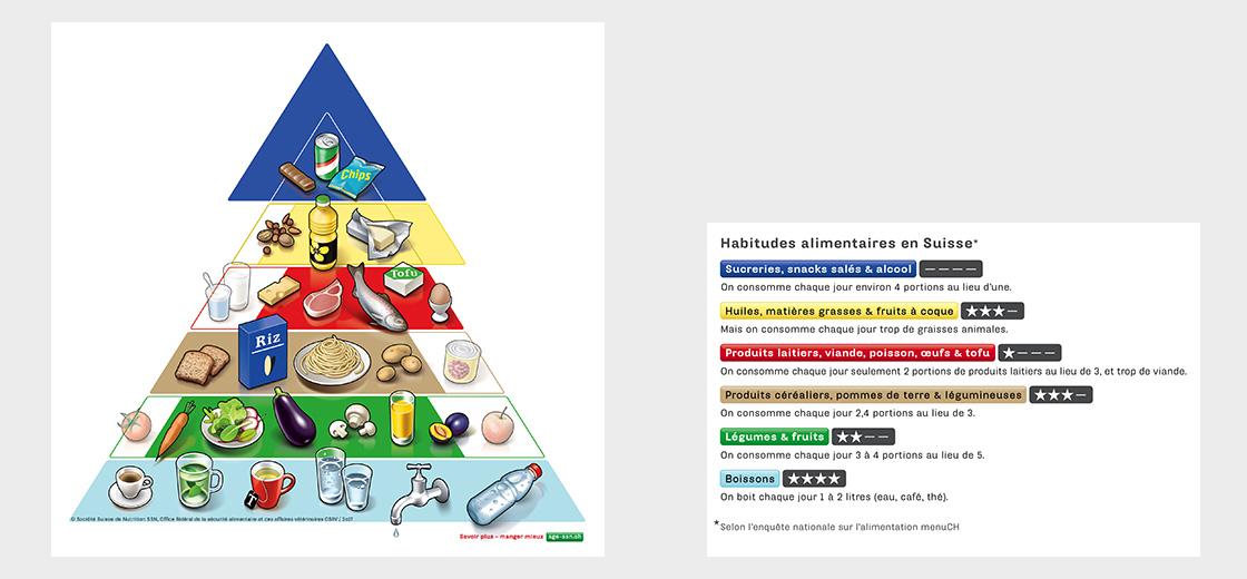 En mars 2017, l’enquête nationale sur l’alimentation menuCH a révélé les premières données représentatives de la consommation et des comportements alimentaires en Suisse. Ses résultats montrent que le régime de la population suisse s’apparente à une pyramide alimentaire inversée.